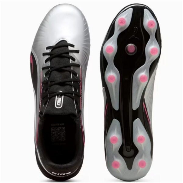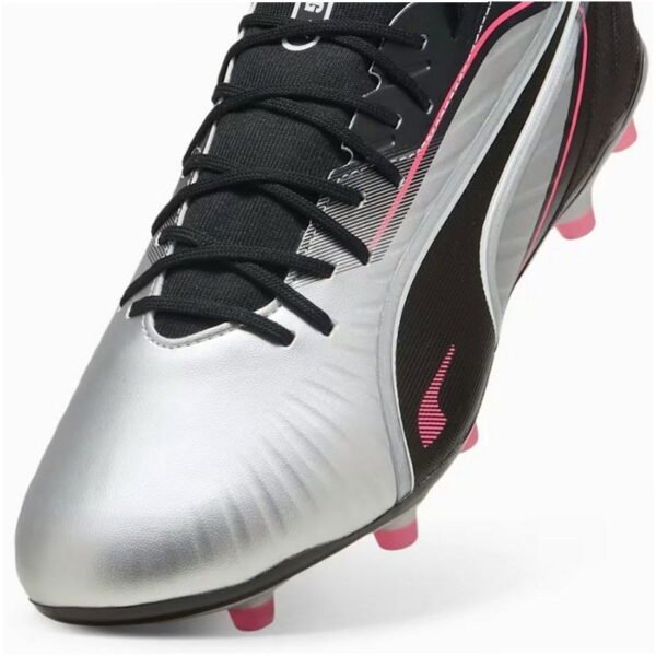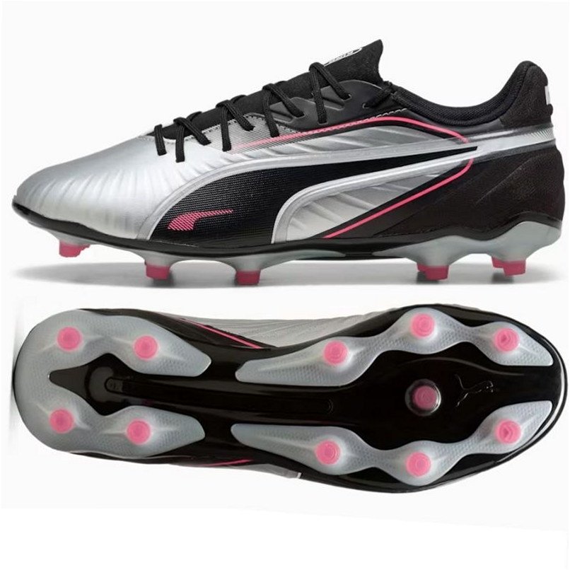 The Puma King Match FG/AG M football boots are designed for men who play on both natural and artificial grass. They feature a low, lace-up design and a rubber outsole with studs, ensuring excellent traction on the field. Made from synthetic materials, these grey boots offer comfort and durability. Available in various sizes, they ensure the right fit for every player.