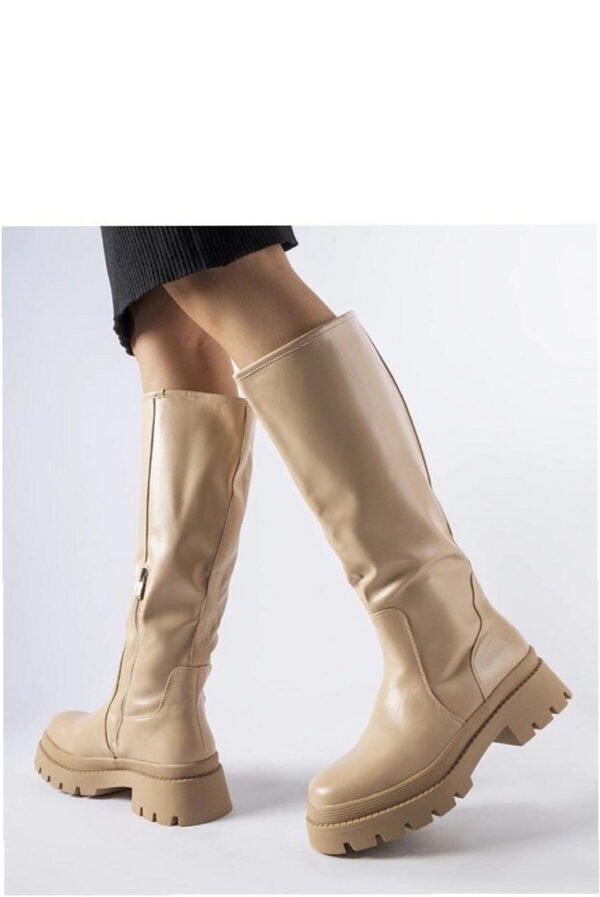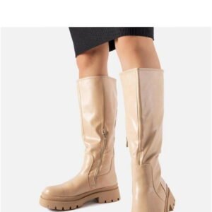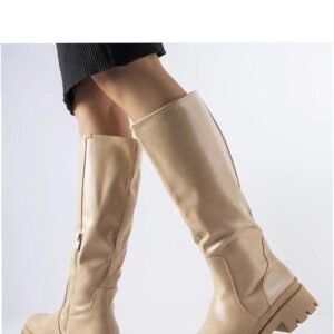 The Christien beige flat classic knee boots by Solea are ideal for chilly days, designed with a convenient zipper for easy on and off. Featuring a robust rubber sole, these boots offer excellent traction whether you’re strolling through the city or venturing into the countryside. The timeless round toe design exudes elegance, while the tailored fit ensures comfort during wear. With a flat heel providing stability and a warm interior to shield against the cold, these boots combine style and functionality. The height of the boots measures 43 cm, made from eco-friendly leather.