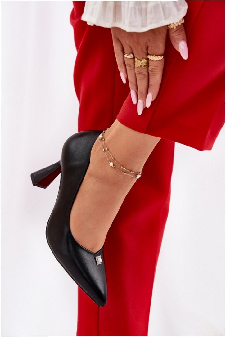 Step in Style presents elegant women’s heels designed for special occasions, crafted from premium eco leather. Featuring a flattering flared stiletto heel, these shoes radiate classic charm. With their pointed toes, they promote a slender silhouette while accentuating feminine allure. The natural leather insole provides lasting comfort, making them ideal for pairing with elegant trousers, dresses, or skirts. These heels are a superb option for ceremonies, formal events, and any occasion where style matters.